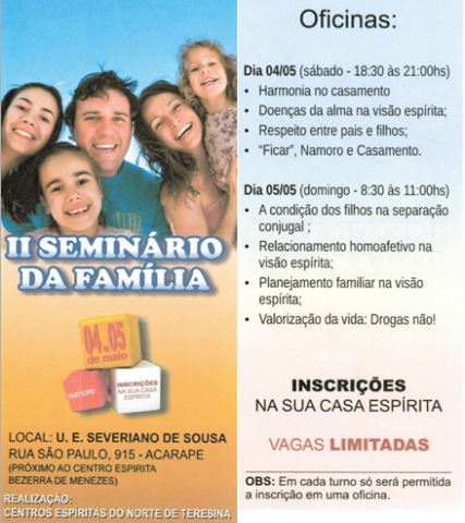Os centros espíritas da Zona Norte de Teresina, com o apoio da FEPI, realizarão o 2º Seminário da Família, nos dias 04 e 05 de maio, na Unidade Escolar Severiano de Sousa, próximo ao C. E. Bezerra de Menezes, na Rua São Paulo, 915, no bairro Acarape. O evento visa refletir sobre temas importantes para a valorização e a melhoria do convívio doméstico.