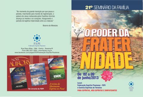 O 21º Seminário da Família, promovido pela FEPI e pelos Centros Espíritas de Teresina, irá ocorrer de 02 a 09 de junho de 2013. O evento será marcado por um ciclo de palestras que terá início no auditório da Federação, a partir das 18 horas do dia 02, proferida pelo presidente José Lucimar de Oliveira. O tema das palestras é "O Poder da Fraternidade no Convívio com o Semelhante", que será abordado nas casas espíritas teresinenses, através de destacados colaboradores do movimento espírita estadual, nos dias e horários indicados na tabela a seguir.