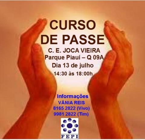 A Federação Espírita Piauiense, através do Departamento de Atendimento Espiritual (DATE), irá promover um curso de passes no dia 13 de julho de 2013, no Centro Espírita Joca Vieira, a partir das 14:30h.