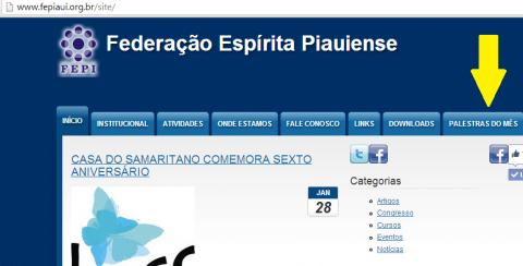 A partir do mês de fevereiro, foi acrescentado um link no menu do site da FEPI, onde será possível consultar as palestras mais facilmente, basta clicar no ícone PALESTRA DO MÊS. Assim, caso a notícia da atualização das palestras fique inacessível, o internauta poderá consultar a relação de palestras de forma mais prática.