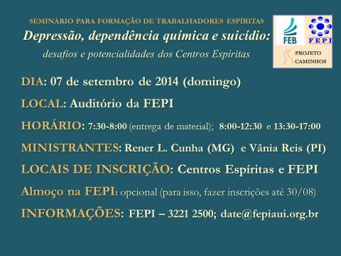 É um evento integrado ao Projeto Caminhos, voltado para evitar a depressão, dependência química e o suicídio. O Seminário ocorrerá no dia 07 de setembro no auditório da FEPI, sob a responsabilidade da equipe do Date, de acordo com o cronograma a seguir.