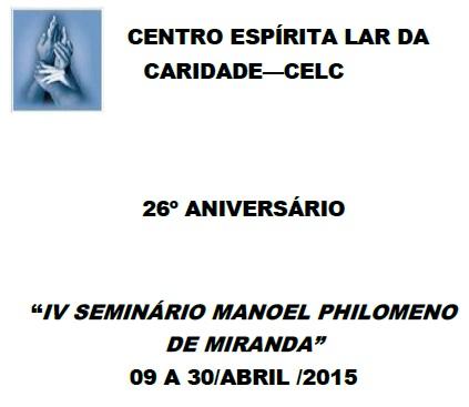 Acontece durante o mês de abril no Centro Espírita Lar da Caridade o 26º aniversário do Centro Espírita e a IV Seminário Manoel Philomeno de Miranda com o tema “Das patologias aos transtornos Espirituai” na sede do C.E.