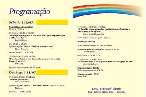 No seminário serão abordadas temáticas como educar para amar, a família como primeira instituição acolhedora e educadora do espirita, jesus: modelo e guia para educação integral do ser dentre outros.