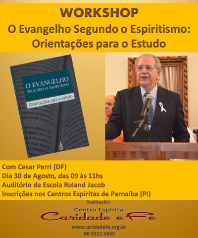 Neste domingo, 30 de agosto, será realizado na cidade de Parnaíba o workshop - O Evangelho Segundo o Espiritismo: orientações para o estudo, com o ex-presidente da FEB, Cesar Perri, do Distrito Federal.
