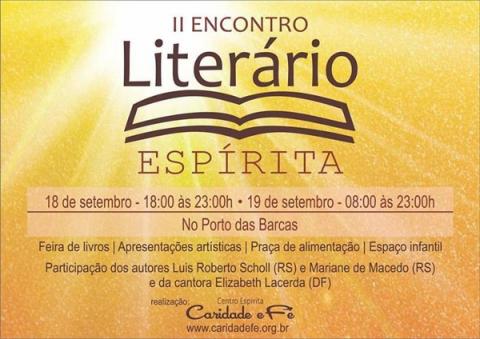 O Centro Espírita Caridade e Fé irá promover nos dias 18 e 19 de setembro, o II Encontro Literário Espírita, na cidade de Parnaíba, com a participação dos autores Luis Roberto Scholl (RS), Mariane de Macedo (RS) e a cantora Elizabeth Lacerda (DF).