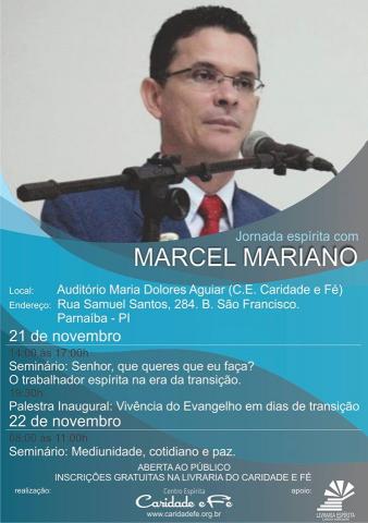 O Centro Espírita Caridade e Fé sediará a Jornada Espírita com Marcel Mariano (BA) nos dias 21 e 22 de novembro, abordando os seguintes temas: O trabalhador espírita na era da transição e Mediunidade, cotidiano e paz. Na ocasião ele fará uma palestra, na inauguração oficial de nosso auditório, que tem por nome Maria Dolores Aguiar, fundadora da casa, com tema: Vivência do Evangelho em dias de transição.