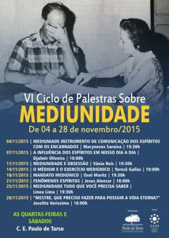 O Centro Espírita Paulo de Tarso realiza no período de 04 a 28 de novembro o VI Ciclo de Palestras sobre a Mediunidade. Serão abordadas diversas temáticas como mediunidade e obsessão, fenômenos espíritas, a influência dos espíritos em nosso dia a dia dentre outros.