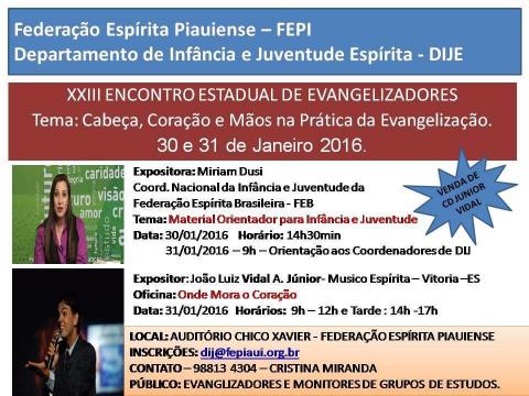" Cabeça, Coração e Mãos na Prática da Evangelização " O departamento de Infância e Juventude da Federação Espírita Piauiense realizará nos dias 30 e 31 desse mês , a 23o Edição do Encontro Estadual de Evangelizadores. O encontro é destinado aos evangelizadores e monitores de grupos de estudos das casas espíritas do PI, acontecerá no auditório da FEPI . Informações com Cristina Miranda 98813 4304.