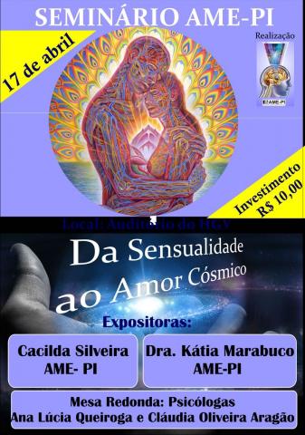Domingo , agora dia 17 de Abril, a AME PIAUI realiza no auditorio do HGV um seminario com um tema bastante oportuno: Da sensualidade ao Amor Cosmico , das 08hs da manha a 12hs, Dra Kátia Marabuco , Presidente da Associação Médico Espírita do Piauí com a Filósofa Cacilda Silveira irão abordar esse tema com bastante profundidade e além disso haverá Mesa Redonda com as Psicólogas Ana Lúcia e Cláudia Aragão , domingo próximo das 08hs a 12hs.