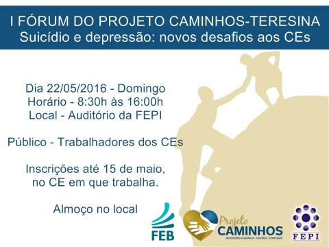 A Federação Espírita Piauiense e colaboradores do Projeto Caminhos/FEB – Núcleo Teresina realizam no domingo (22), no horário de 8h30 às 16h, na sede da FEPI o I Fórum do Projeto Caminhos/Teresina sobre Suicídio e depressão: novos desafios aos Centros Espíritas. O evento é voltado para trabalhadores de casas espíritas da Capital.