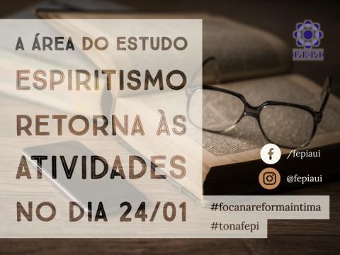 A Área de Estudo do Espiritismo da FEPI informa que as atividades voltarão no dia 24 de janeiro para as turmas da terça-feira e no dia 28 de janeiro para as turmas do sábado. Quem deseja iniciar nos estudos sobre a Doutrina Espírita basta ir à federação em um desses dias.