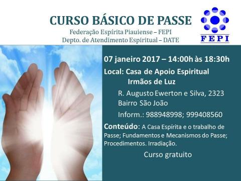 A Federação Espírita Piauiense, através do Departamento de Atendimento Espiritual, realiza no dia 07 de janeiro de 2016 na Casa de Apoio Espiritual Irmãos de Luz, curso básico de passe.