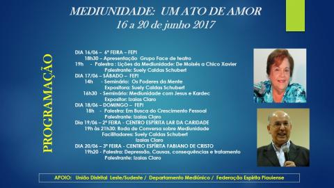 A Federação Espírita Piauiense com o apoio da União Distrital Espírita Leste Sudeste realiza o Encontro: Mediunidade um ato de amor entre os dias 16 a 20 de junho na Federação Espírita Piauiense, Centro Espírita Lar da Caridade e Centro Espírita Fabiano de Cristo. O evento contará com a participação dos renomados palestrantes e escritores espíritas Suely Caldas Schubert e Izaias Claro.