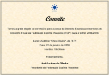 Na sexta-feira (21) aconteceu reunião solene do Conselho Deliberativo da Federação Espírita Piauiense com o objetivo de dar posse à Diretoria Executiva e Conselho Fiscal, eleitos através de voto no dia 06 de dezembro de 2015. O evento aconteceu no auditório Chico Xavier e reuniu diretores, coordenadores, trabalhadores e frequentadores da Instituição.