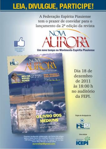 Federação Espírita Piauiense lança no próximo dia 18/12 (domingo) a partir das 18h, a 2ª edição da Revista Nova Aurora. No mesmo horário, será apresentado o Recital de Natal pelo Coral da FEPI e uma palestra de 25 minutos.